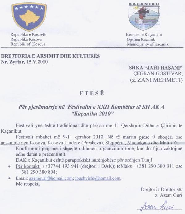 Home Ftesa Ftesë për festivalin Kaçanik 2010