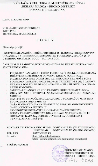 Ftesë për festivalin ndërkombëtar “Behar” Maoca – Bërçko (Bosnë dhe Hercegovinë)