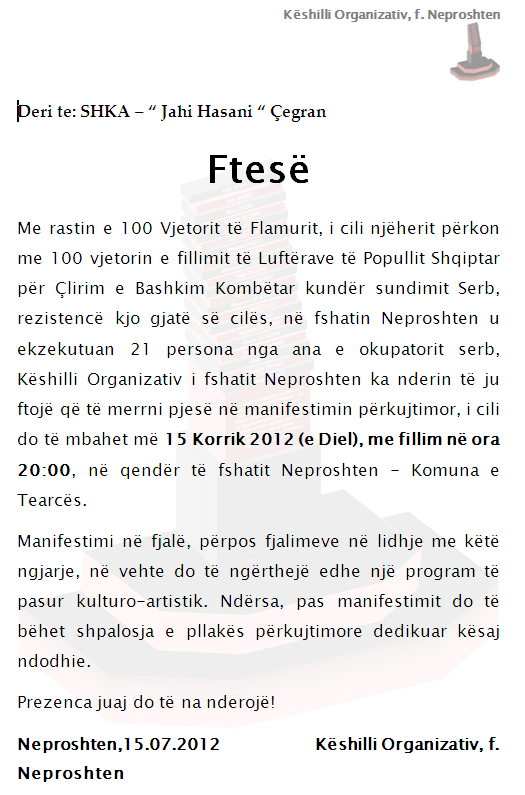 Home Aktivitete Ftesë për pjesmarje në Neproshten 2012